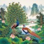 This artwork from the Chinese Diverse Theme Art collection captures a breathtaking scene of a peacock with its feathers fully spread beside a pheasant, set amidst a blooming lotus pond and distant misty mountains. A small bridge and boat in the background complete the tranquil setting, symbolizing prosperity, grace, and natural harmony.