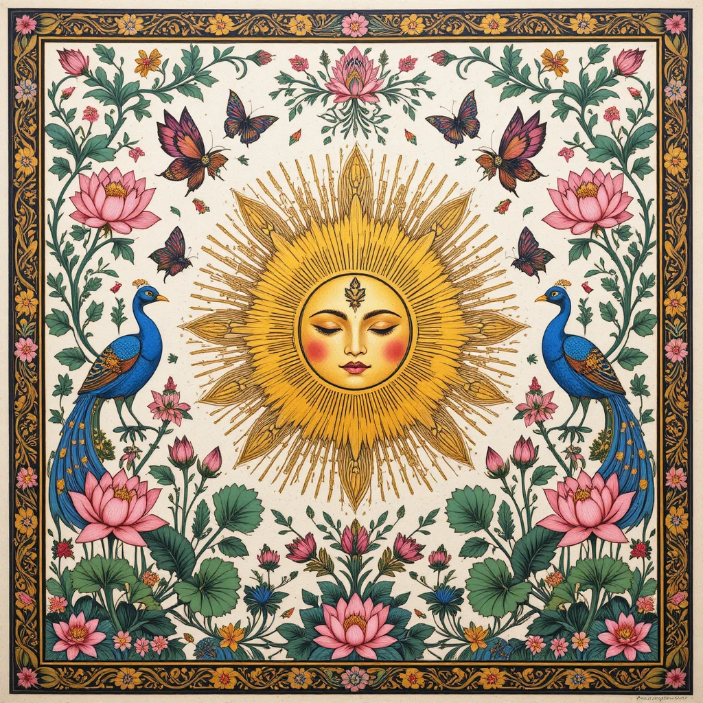 “A high-resolution Madhubani painting depicting the beauty of Spring Bloom with Divine Aura. A radiant golden aura shines behind a symbolic sun face at the center, surrounded by blooming lotus flowers, butterflies, and peacocks on both sides. The background is off-white with bold black outlines and earthy spring colors — pastel pink, bright green, sky blue, sunny yellow, and warm gold tones. The canvas is filled with dense floral vines, geometric borders, and folk motifs with no empty spaces, following traditional Madhubani symmetry. Every element is crisp, vibrant, and intricately detailed for a divine and harmonious spring atmosphere.”