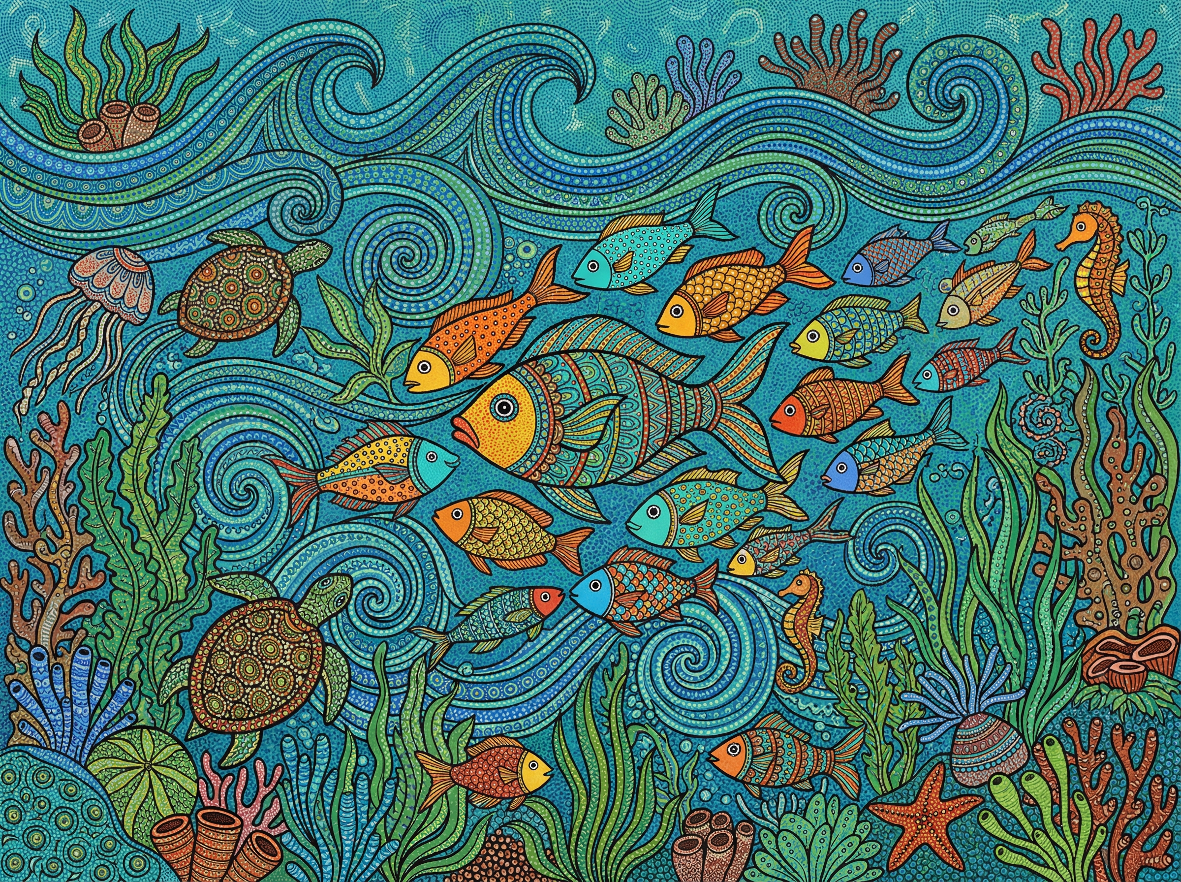 Dive into the beauty of the ocean with this vibrant Ocean Life Gond Art.