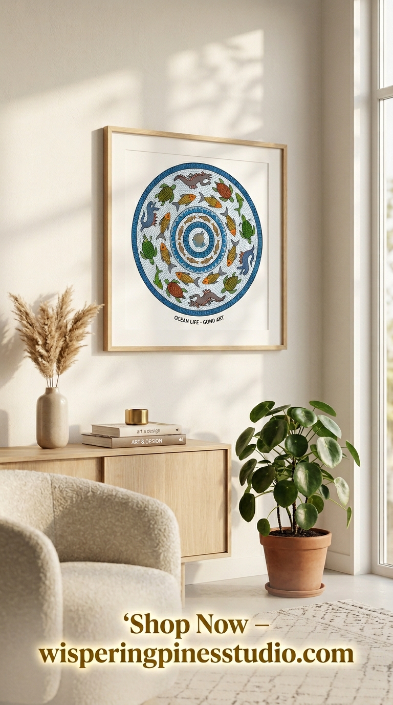 Inspired by traditional Indian tribal art, this piece features flowing patterns, detailed fish, and rhythmic lines that bring life, movement, and storytelling into your space.