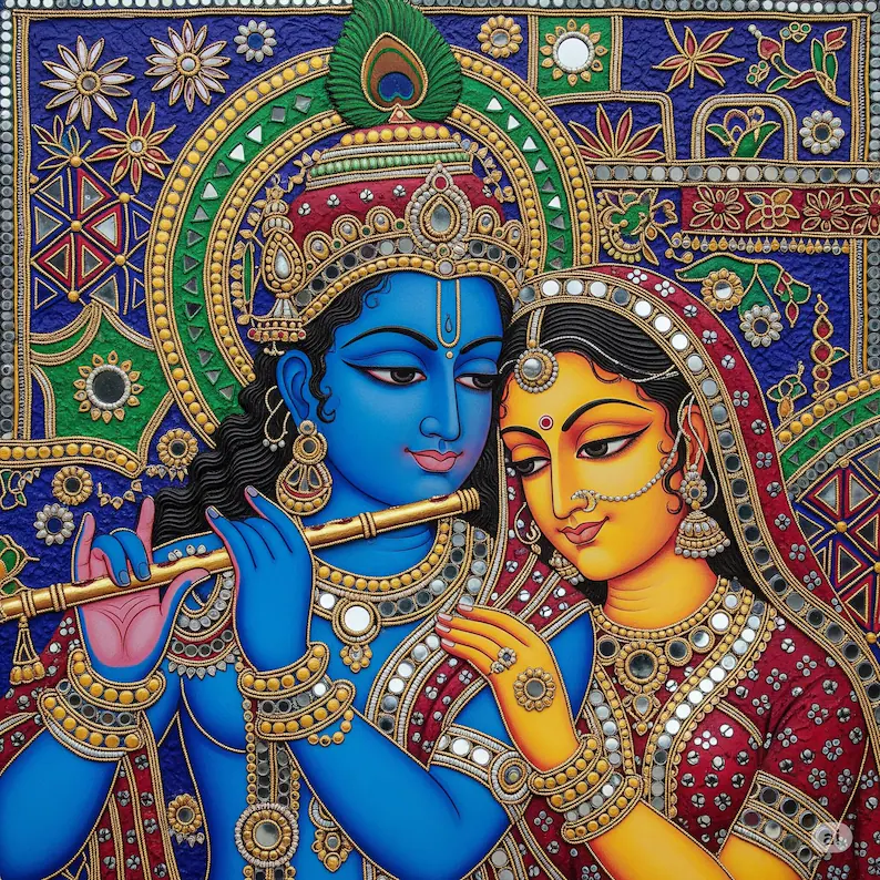 Radha Krishna Lippan Art Print: Traditional Indian Mud & Mirror Painting