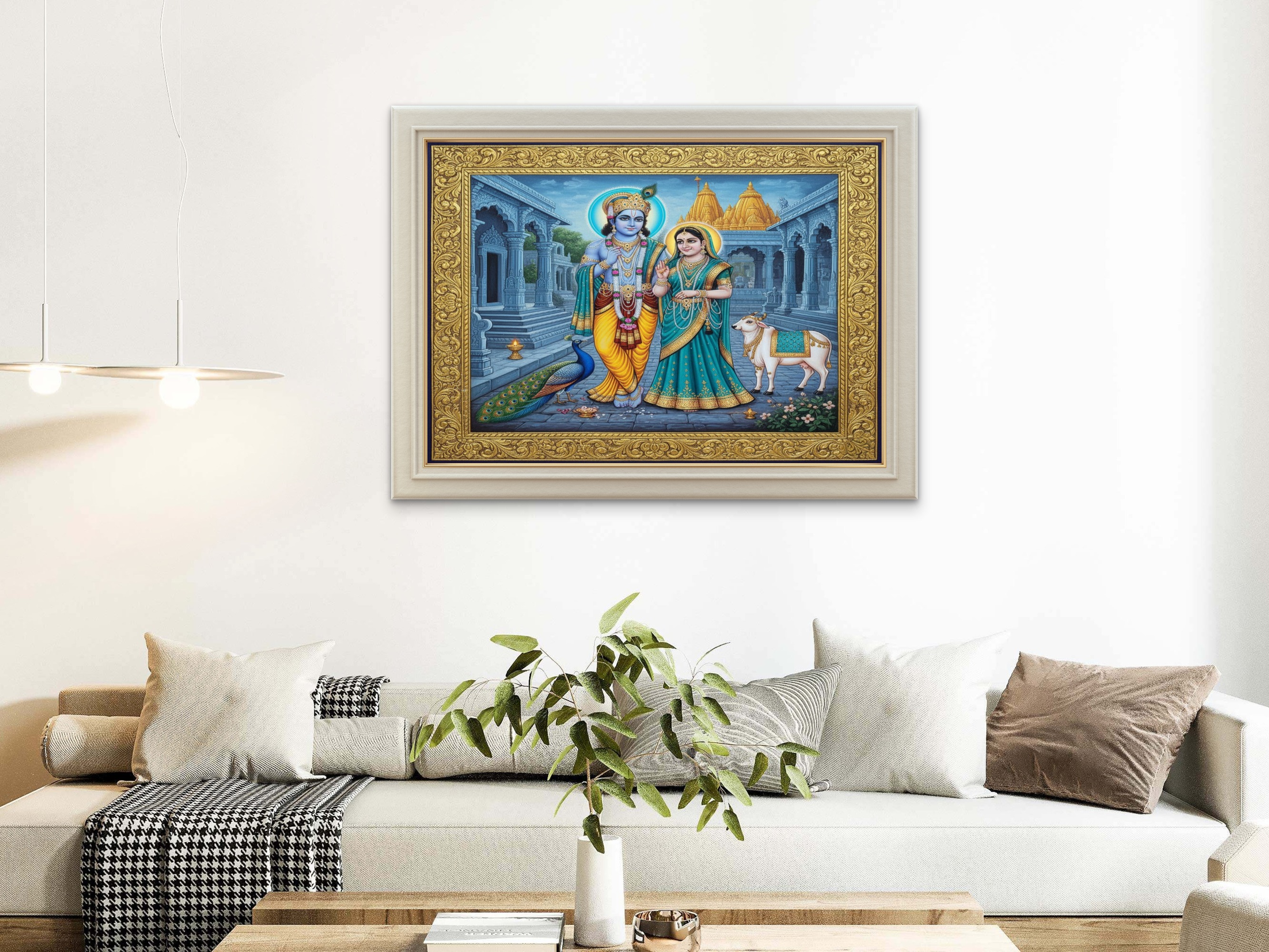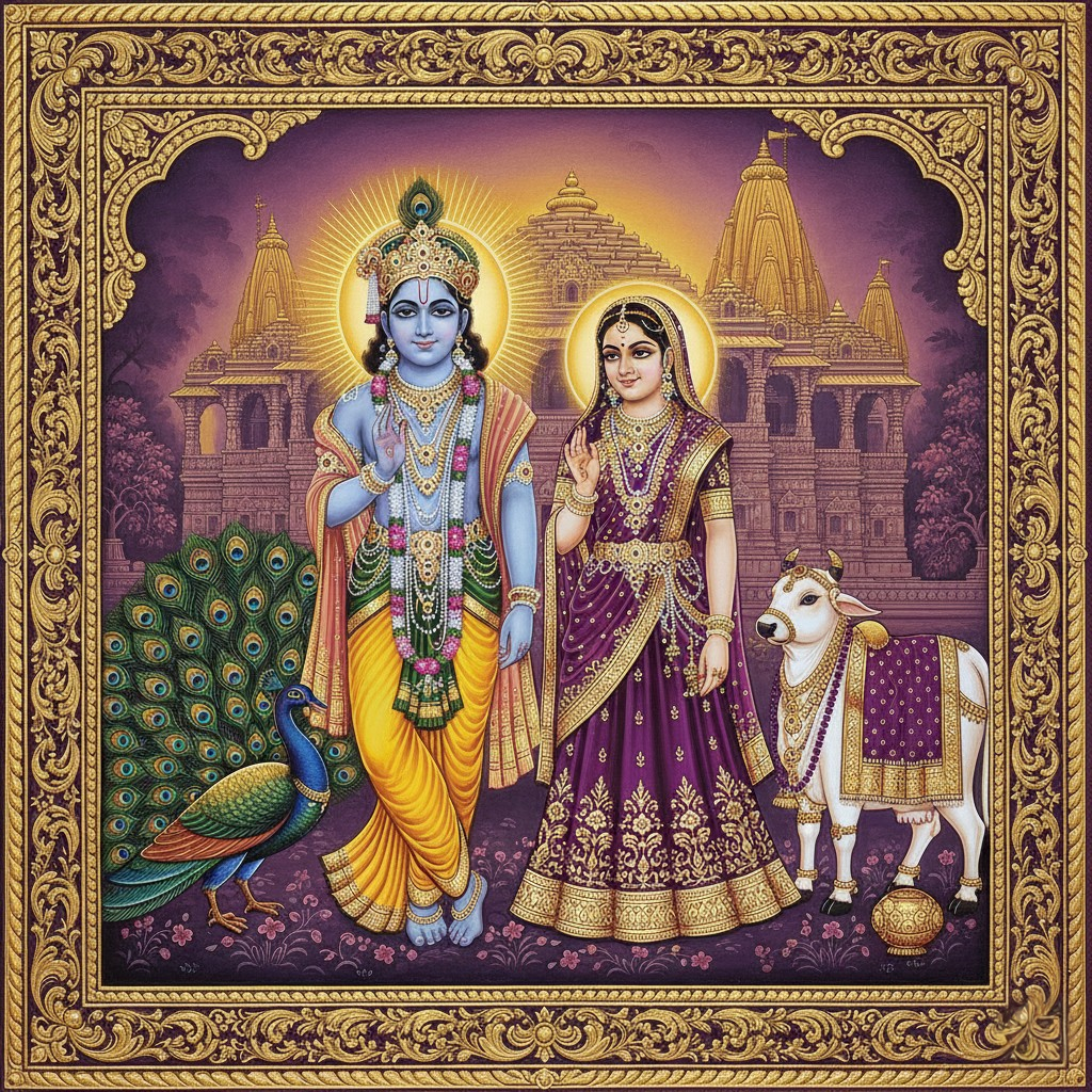 A regal purple-gold Tanjore artwork of Radha and Krishna with a peacock and cow on the Dwarka temple street. Deep violet hues mix with glowing gold textures, making this a luxurious devotional centerpiece perfect for classical Indian décor and elegant home settings.